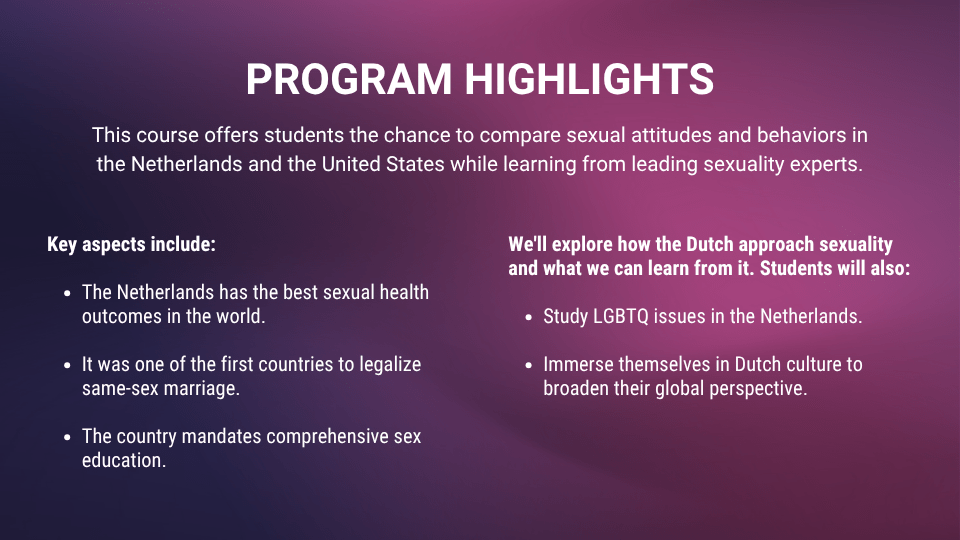 This course offers students the opportunity to perform a comparative analysis of sexual attitudes and behaviors in the Netherlands and the United States. The Netherlands provides a fascinating cultural contrast because, in addition to having the best sexual health outcomes in the world, the Dutch were among the first to legalize same-sex marriage, they have mandated comprehensive sex education, and they have decriminalized and regulated the sale of sex. We will explore the Dutch model of sexuality in depth and consider what we can learn from it. Students will also learn about LGBTQ issues in the Netherlands and have the opportunity to immerse themselves in Dutch culture in order to enhance their cultural sensitivity and global perspective.